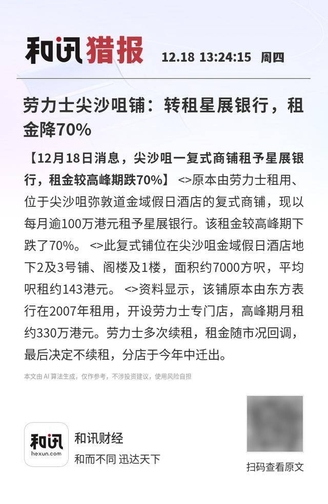 【12月18日消息,尖沙咀一复式商铺租予星展银行,租金较高峰期跌70%】原本由劳力士租用、位于尖沙咀弥敦道金域假日酒店的复式商铺,现以每月逾100万港元租予星展银行。该租金较高峰期下跌了70%。 此复式铺位在尖沙咀金域假日酒店地下2及3号铺、阁楼及1楼,面积约7000方呎,平均呎租约143港元。 资料显示,该铺原本由东方表行在2007年租用,开设劳力士专门店,高峰期月租约330万港元。劳力士多次续租,租金随市况回调,最后决定不续租,分店于今年中迁出。
