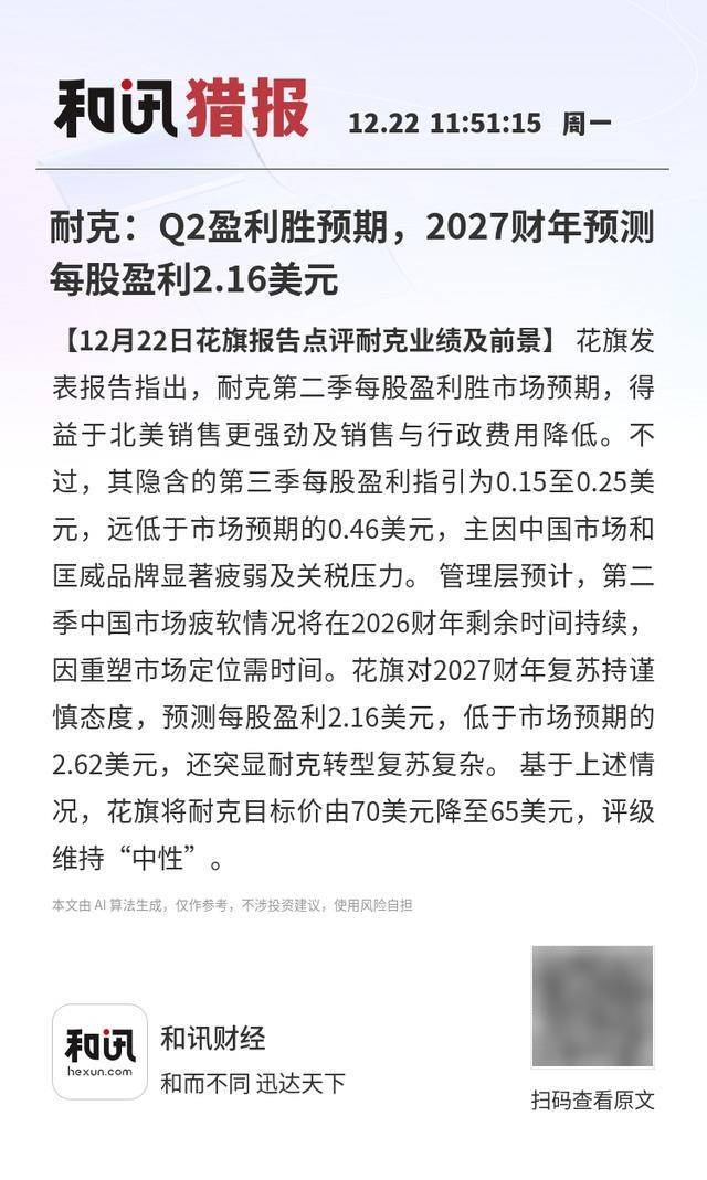 【12月22日花旗报告点评耐克业绩及前景】花旗发表报告指出,耐克第二季每股盈利胜市场预期,得益于北美销售更强劲及销售与行政费用降低。不过,其隐含的第三季每股盈利指引为0.15至0.25美元,远低于市场预期的0.46美元,主因中国市场和匡威品牌显著疲弱及关税压力。 管理层预计,第二季中国市场疲软情况将在2026财年剩余时间持续,因重塑市场定位需时间。花旗对2027财年复苏持谨慎态度,预测每股盈利2.16美元,低于市场预期的2.62美元,还突显耐克转型复苏复杂。 基于上述情况,花旗将耐克目标价由70美元降至65美元,评级维持“中性”。
