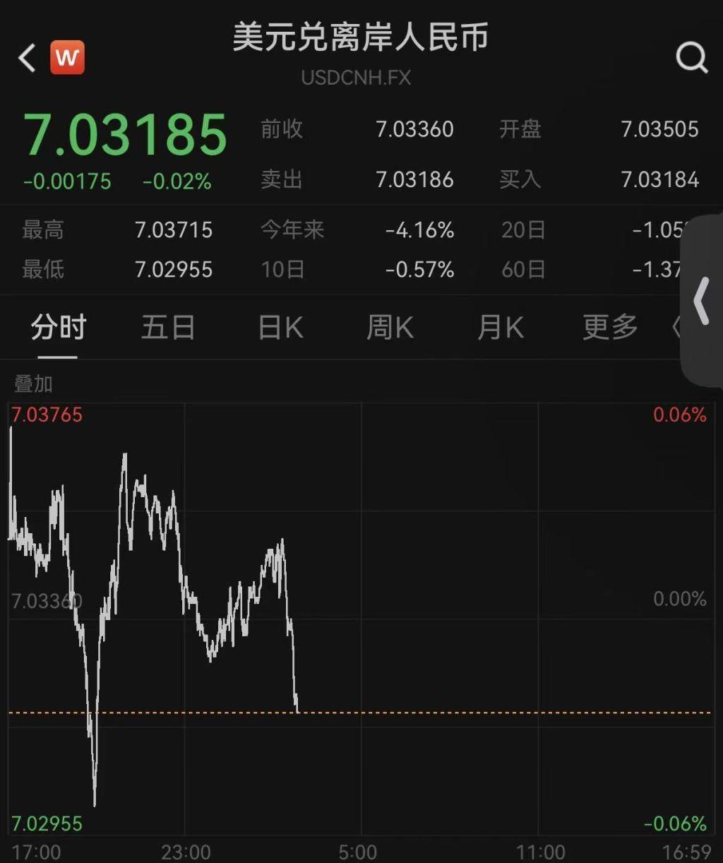 更多反映国际投资者预期的离岸人民币对美元汇率12月22日一度升破7.03关口,截至发稿盘中最高升至7.02955,创下去年10月3日以来的新高。