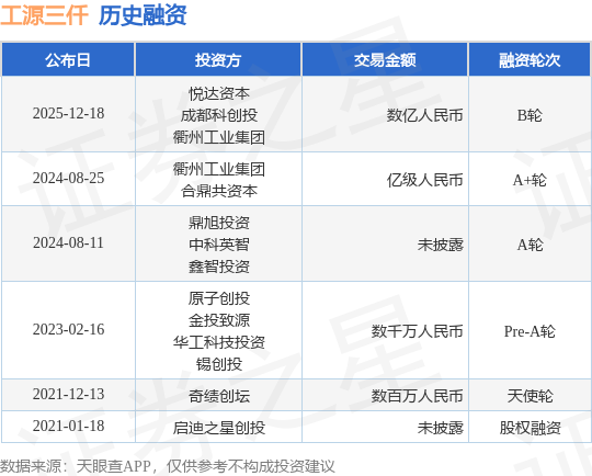 证券之星消息,根据天眼查APP于12月18日公布的信息整理,衢州工源三仟科技有限公司B轮融资,融资额数亿人民币,参与投资的机构包括悦达资本,成都科创投,衢州工业集团。