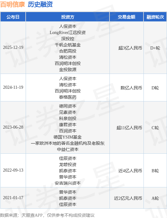 证券之星消息,根据天眼查APP于12月19日公布的信息整理,百明信康生物技术(浙江)股份有限公司D+轮融资,融资额超3亿人民币,参与投资的机构包括人保资本,LongRiver江远投资,深投控,千帆企航基金,合肥高投,清松资本,百润明沣创投,金投致源。