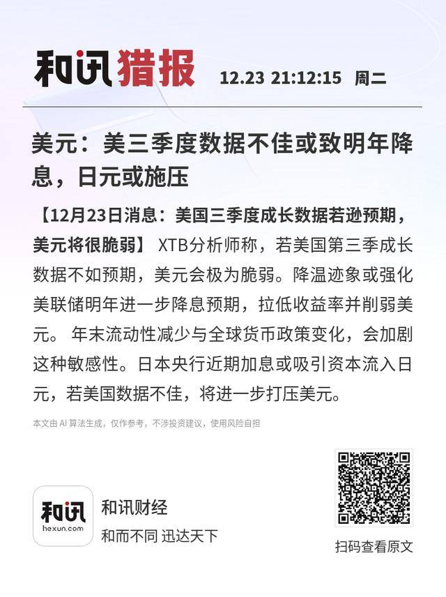 【12月23日消息:美国三季度成长数据若逊预期,美元将很脆弱】XTB分析师称,若美国第三季成长数据不如预期,美元会极为脆弱。降温迹象或强化美联储明年进一步降息预期,拉低收益率并削弱美元。 年末流动性减少与全球货币政策变化,会加剧这种敏感性。日本央行近期加息或吸引资本流入日元,若美国数据不佳,将进一步打压美元。