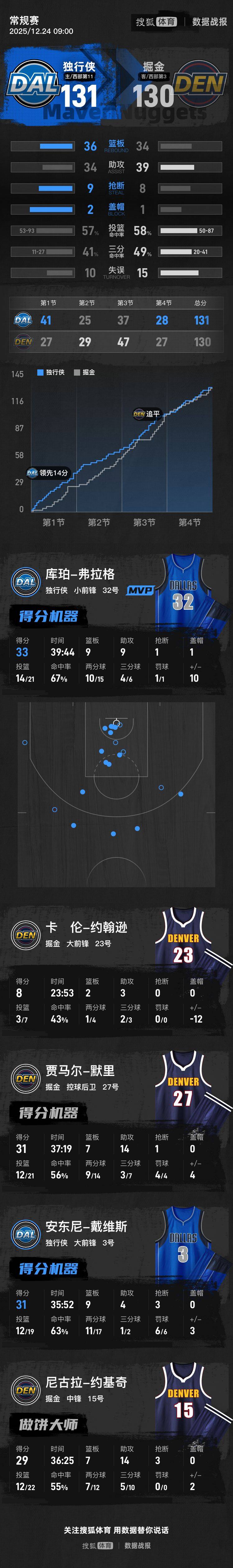 全场具体比分(独行侠队在后):27-41、29-25、47-37、27-28。