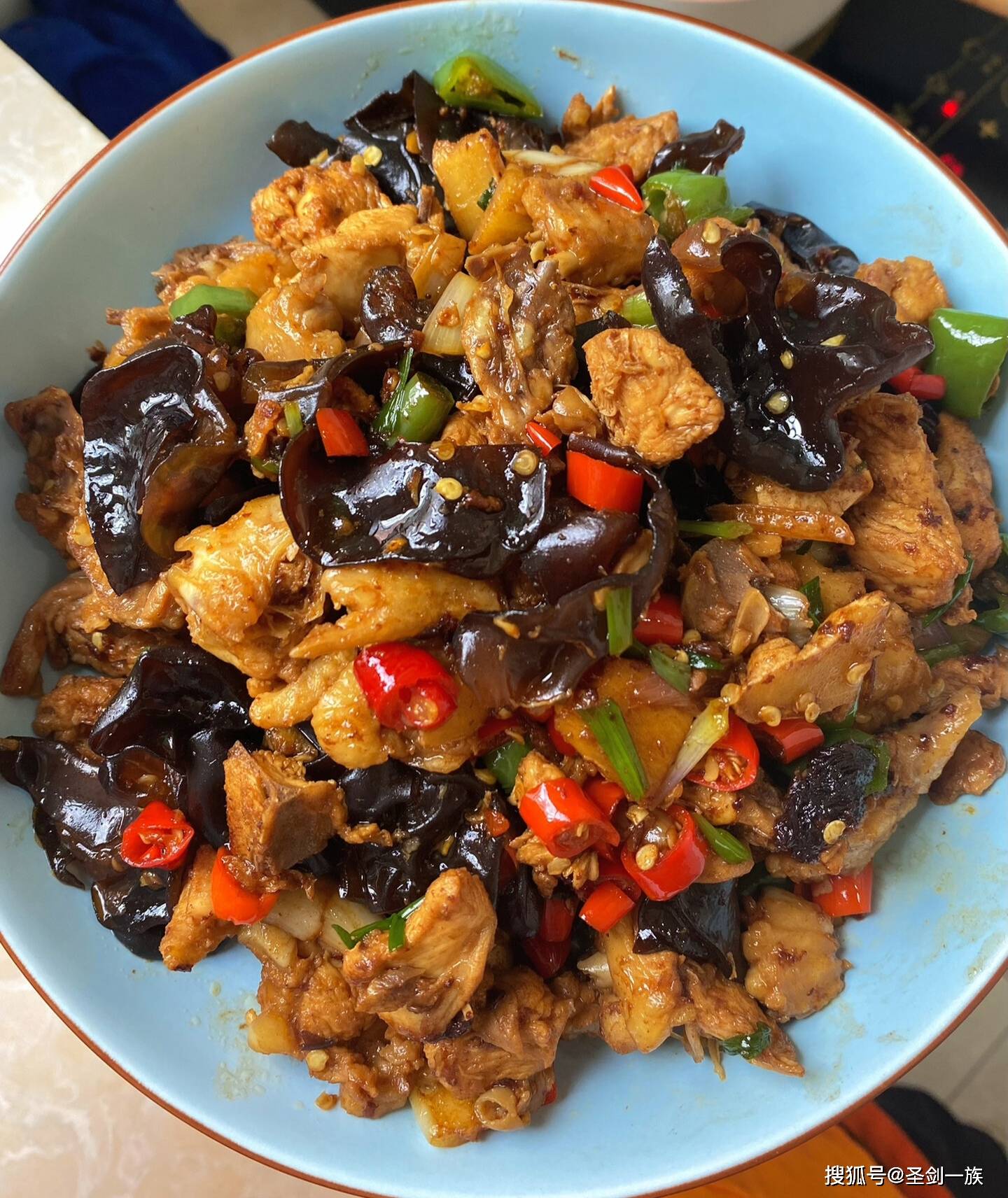 鸡胸肉1块、干木耳1小把、小米辣和线椒各1-2根、生姜粉(或姜末)、料酒、生抽