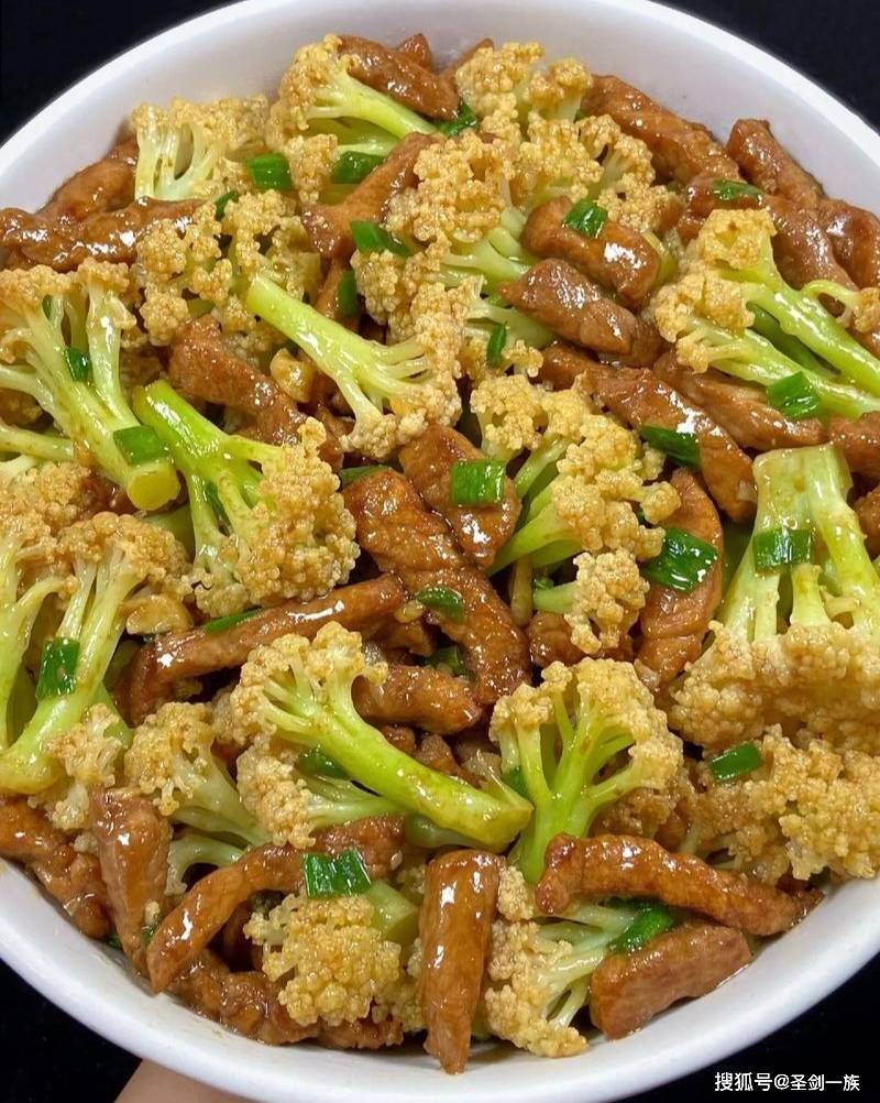 7. 出锅前点入三滴锅边醋,增香提味,装盘后轻颠两下,让菜花蓬松不塌,趁热上桌,肉片滑、菜花脆,香气四溢。