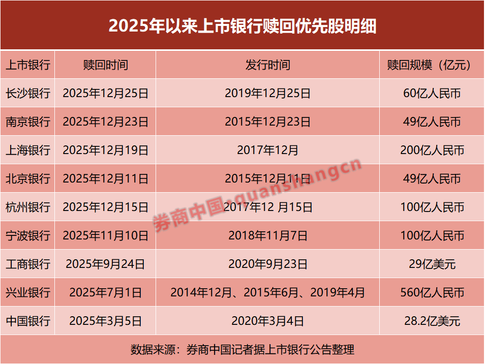 券商中国记者注意到,12月以来,已有北京银行、上海银行、杭州银行和南京银行等5家银行先后宣布对旗下优先股进行赎回,合计规模达458亿元。若加上此前工商银行、中国银行、兴业银行及宁波银行,2025年以来赎回优先股的银行数量已增加至9家。