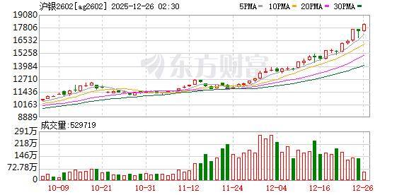 12月25日晚间,贵金属期货走强,沪银夜盘涨超18000元/千克,创历史新高,当前涨幅接近5%。