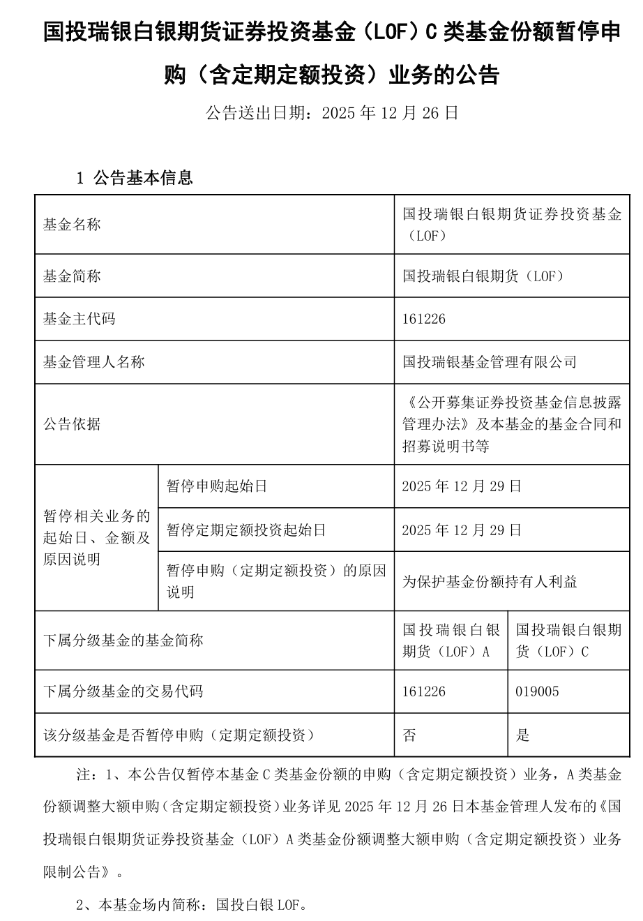 每经AI快讯,12月26日,国投白银LOF发布公告,为保护基金份额持有人利益,国投瑞银白银期货证券投资基金(LOF)C类基金份额将从2025年12月29日开始暂停申购。本基金取消或调整2025年12月29日起的暂停C类基金份额申购(含定期定额投资)业务的具体时间将另行公告。