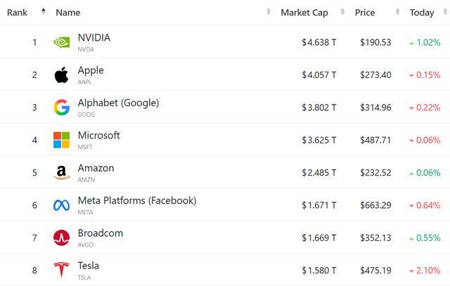 苹果跌0.15%,谷歌C跌0.22%,微软跌0.06%,亚马逊涨0.06%,Meta跌0.64%,博通涨0.55%,特斯拉跌2.1%。