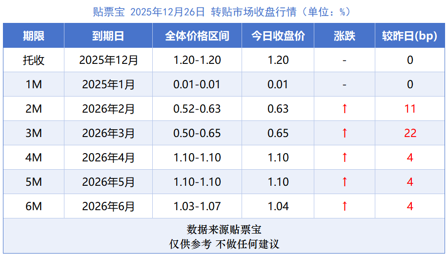 12月26日转贴市场延续昨日修复行情,整体呈现出明显的“顺势抬价”特征。前期回调后,市场情绪逐步企稳,买盘在中短期限集中补位,推动价格继续上行。卖盘报价态度较昨日更为坚挺,低价资源快速消化,期限结构上呈现出“短端稳定、中端领涨、长端跟随”的节奏,转贴市场整体维持偏强运行。