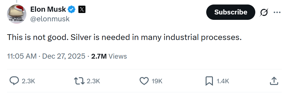 本周白银,迅猛涨势远超黄金。27日,马斯克表达了担忧。直言这对工业发展“不是好事”。