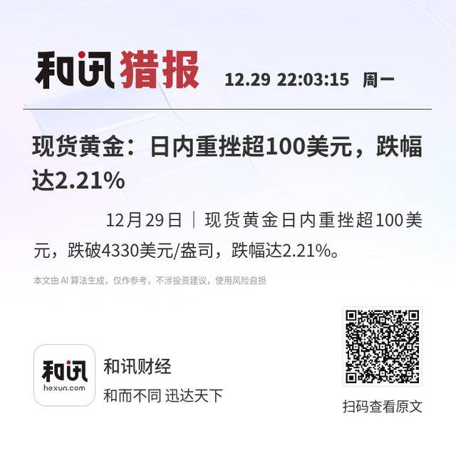 12月29日|现货黄金日内重挫超100美元,跌破4330美元/盎司,跌幅达2.21%。