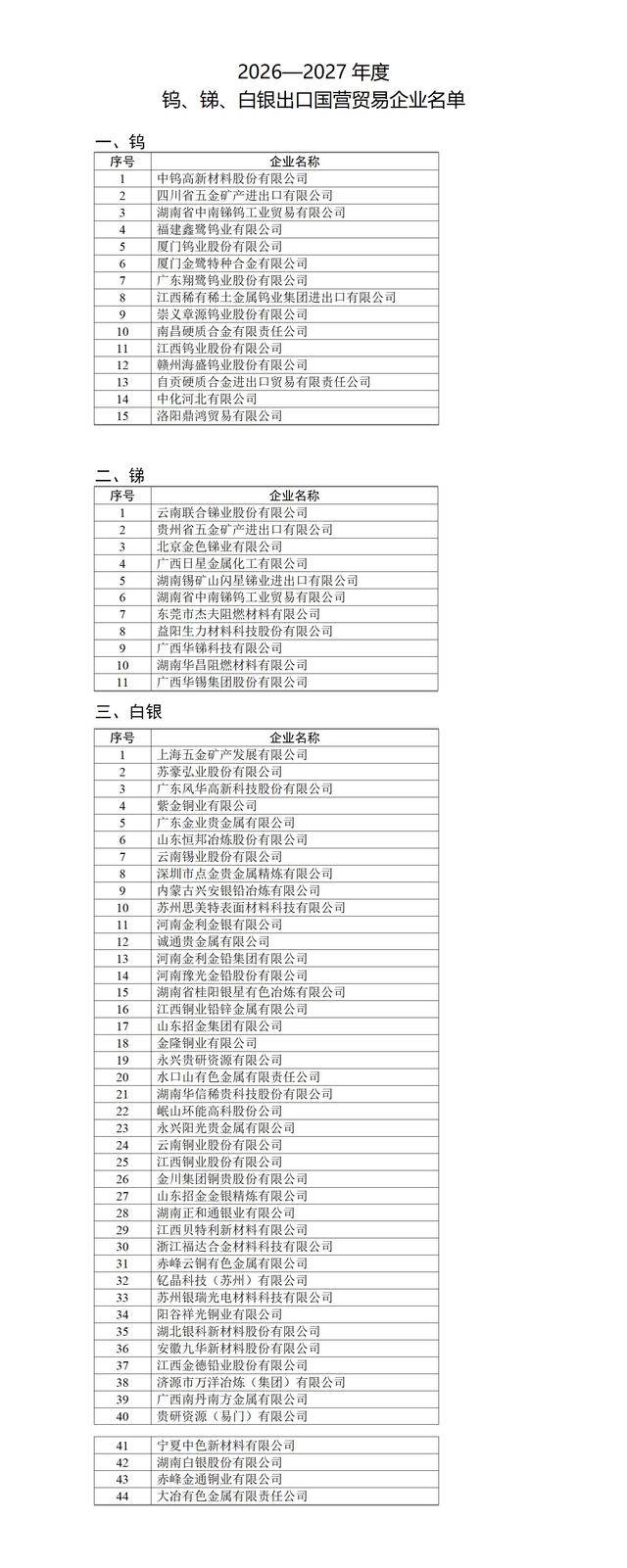 商务部公布最新钨、锑、白银出口国营贸易企业名单