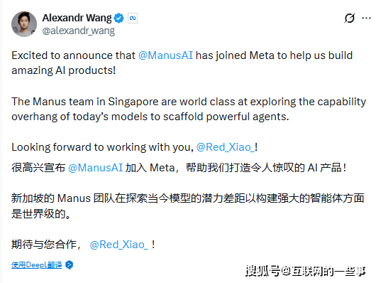 Meta首席AI官Alexandr Wang当天也在X平台发文欢迎Manus加入。Meta CEO扎克伯格甚至私下对肖弘表示,自己是Manus的“老用户”。