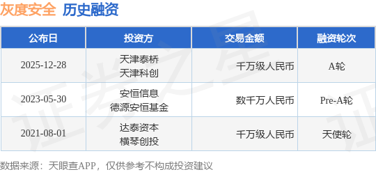 证券之星消息,根据天眼查APP于12月28日公布的信息整理,天津灰度安全科技有限公司A轮融资,融资额千万级人民币,参与投资的机构包括天津泰桥,天津科创。