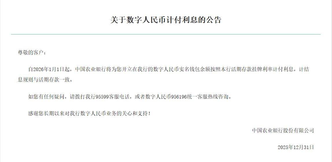 工行、农行、建行、交行、邮储银行均发布公告称,自2026年1月1日起,银行将为客户开立的数字人民币实名钱包余额按照本行活期存款挂牌利率计付利息,计结息规则与活期存款一致。