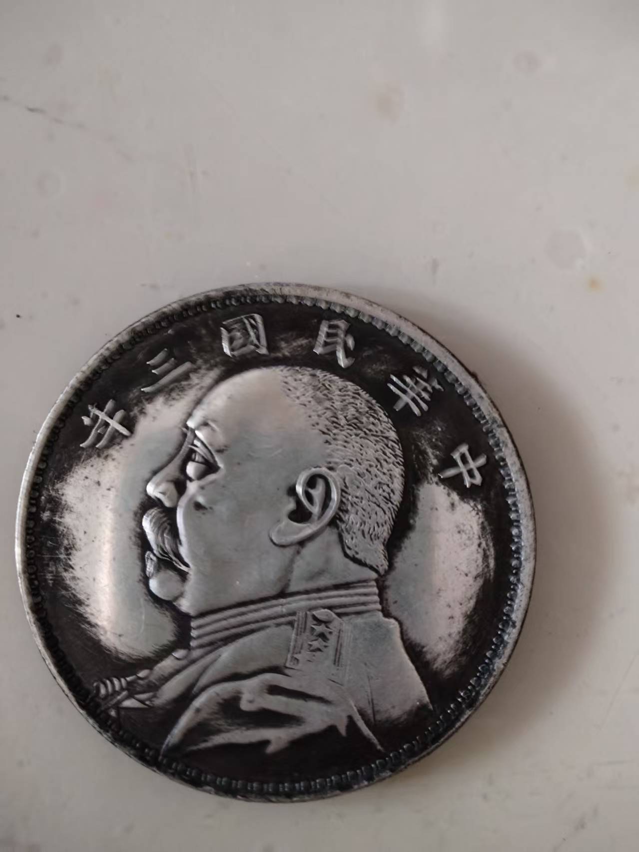 - **文字布局**:“中华民国三年”的字样环绕袁像,字体为隶书变体,笔画厚重——“三年”后未加“造”字,是民国三年袁大头的典型特征(后期年份多添“造”字),这一细节也成了鉴别其年份的核心标识。
