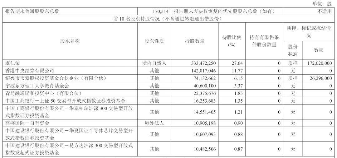 截至2025年9月30日,虞仁荣持股为27.4%,香港中央结算有限公司持股为11.77%,绍兴市韦豪股权投资基金合伙企业(有限合伙)持股为6.15%,宁波东方理工大学教育基金会持股为3.37%,青岛融通民和投资中心(有限合伙)持股为1.85%;