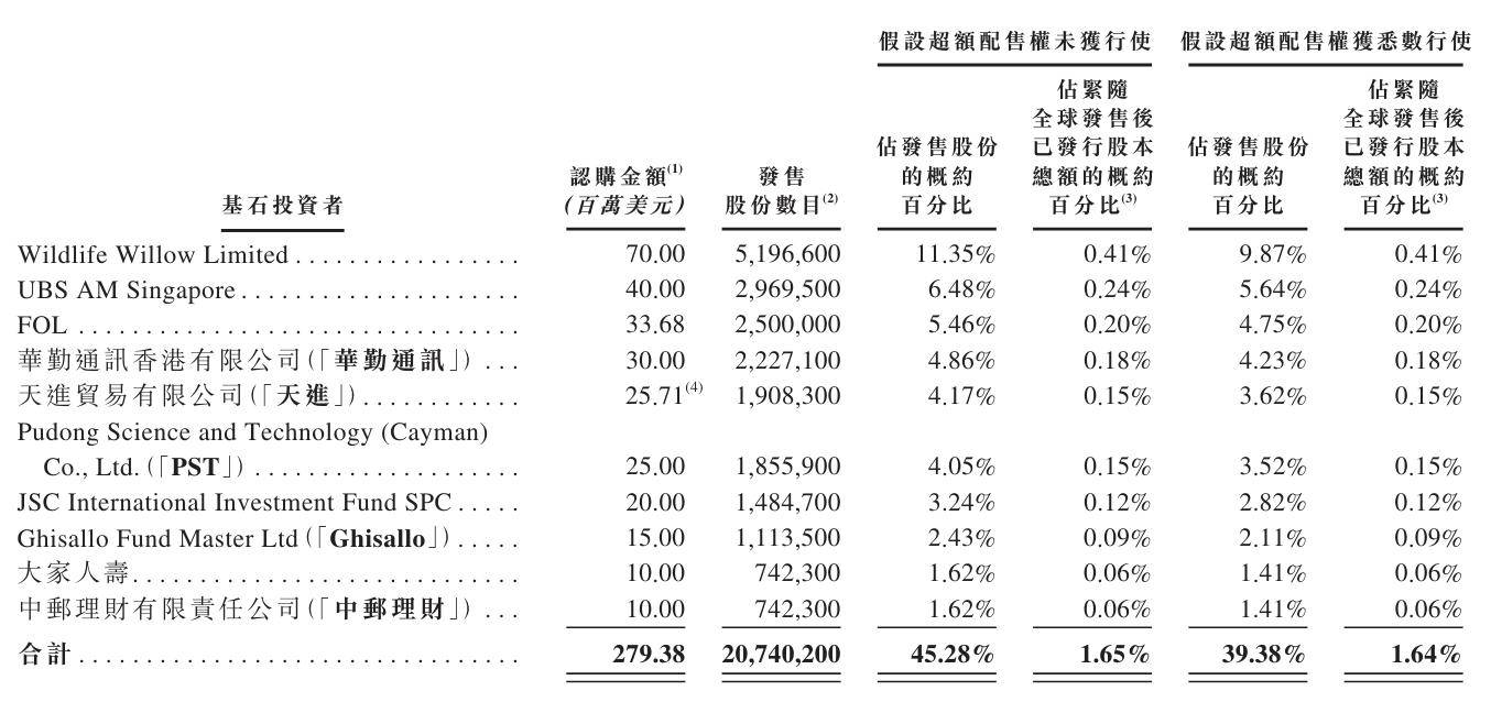 其中,Wildlife Willow认购7000万美元,UBS AM Singapore认购4000万美元,FOL认购3368万美元,华勤通讯认购3000万美元,天进认购2571万美元,PST认购2500万美元,JSC International Investment Fund SPC认购2000万美元,Ghisallo认购1500万美元,大家人寿、中邮理财分别认购1000万美元。