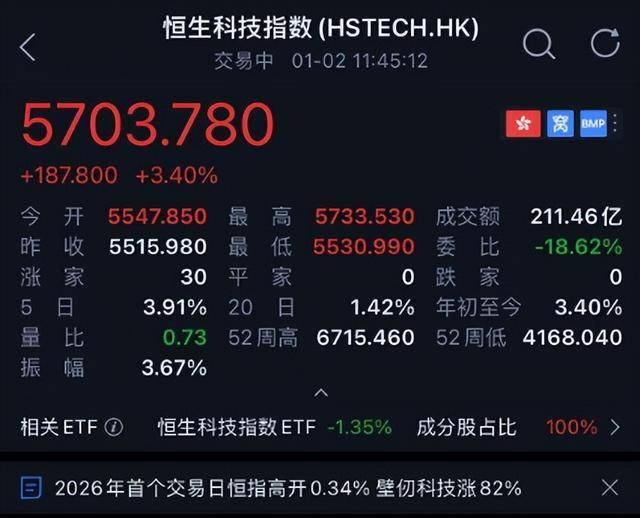 汇率升值的“财富效应”迅速传导至港股市场。作为离岸人民币资产的核心阵地,港股在1月2日迎来全面反弹:恒生指数高开高走,盘中涨幅一度扩大至2.2%;恒生科技指数表现更为亮眼,一度震荡拉升至近4%。资料显示,2025年全年港股通累计净流入港股1.406万亿港元,同比增长74%,内资在港股的话语权不断提升,成为市场稳定运行的“压舱石”。