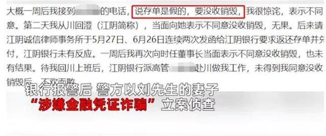2015年,江阴警方以涉嫌金融凭证诈骗对刘海斌的妻子立案调查,并对六百万存单的真伪进行司法鉴定。然而,司法鉴定并未确认存单的真伪,只是表示存单上的印章与银行样本不符。