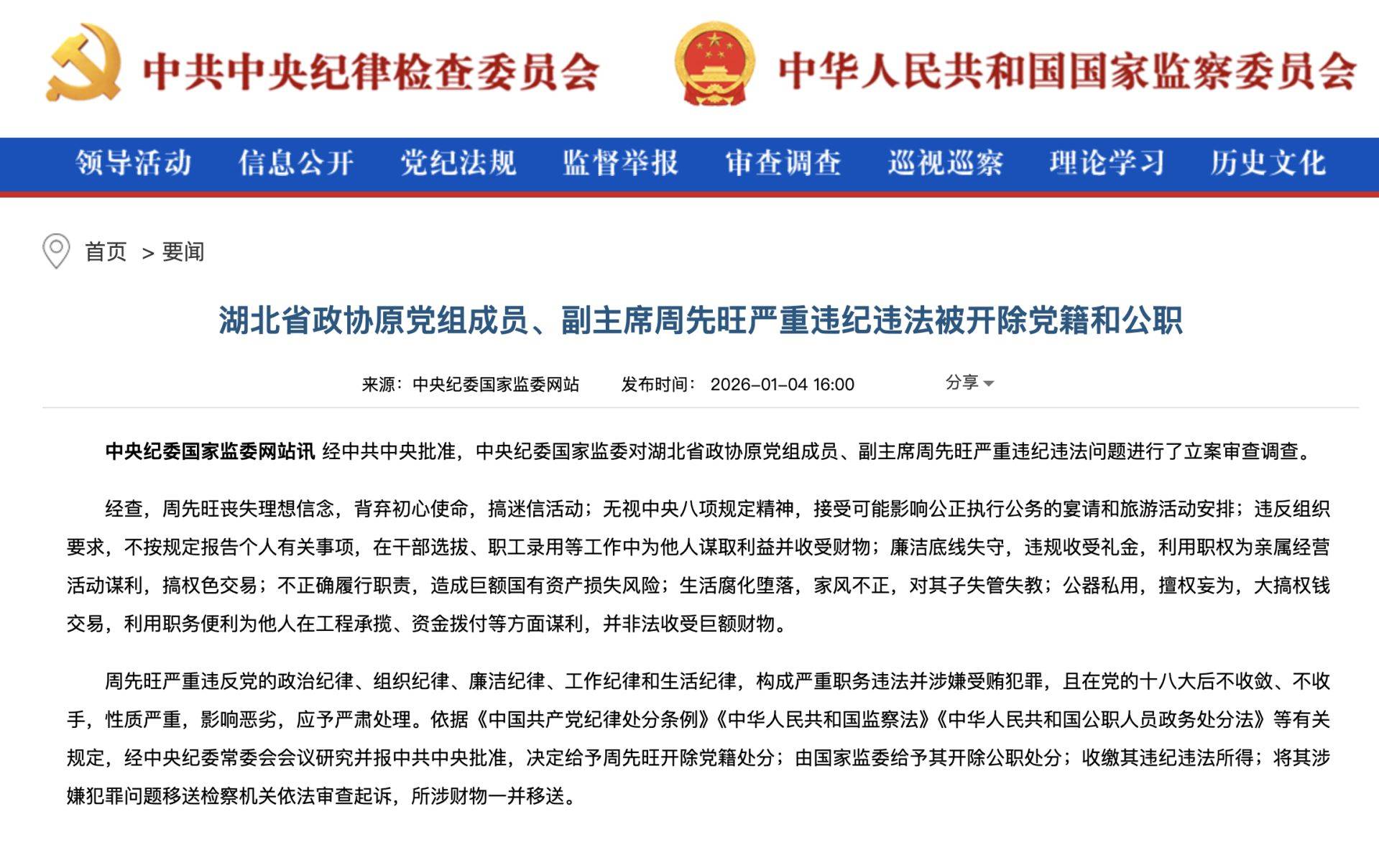 湖北省政协原党组成员、副主席周先旺被“双开”