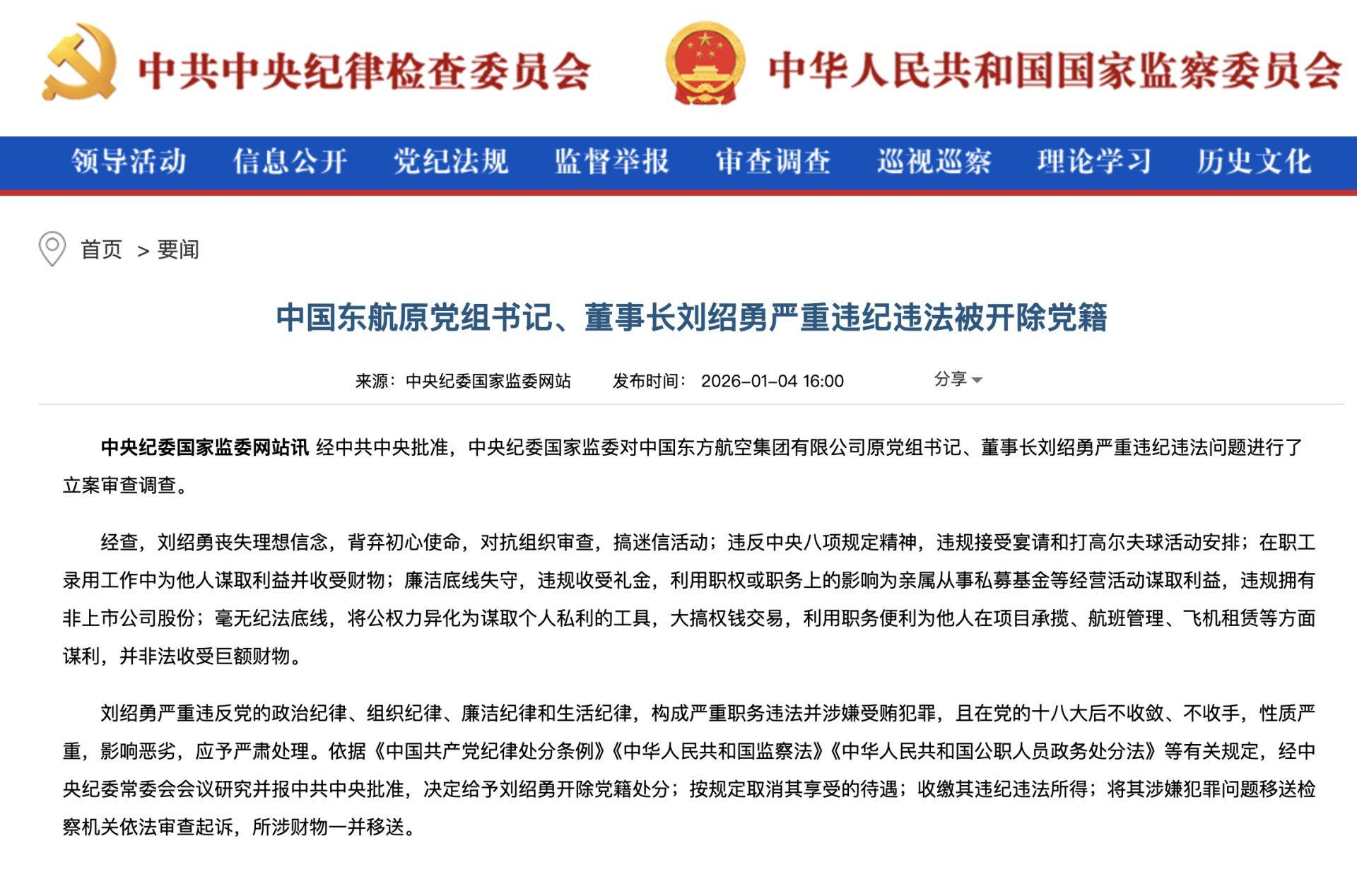 经中共中央批准,中央纪委国家监委对中国东方航空集团有限公司原党组书记、董事长刘绍勇严重违纪违法问题进行了立案审查调查。