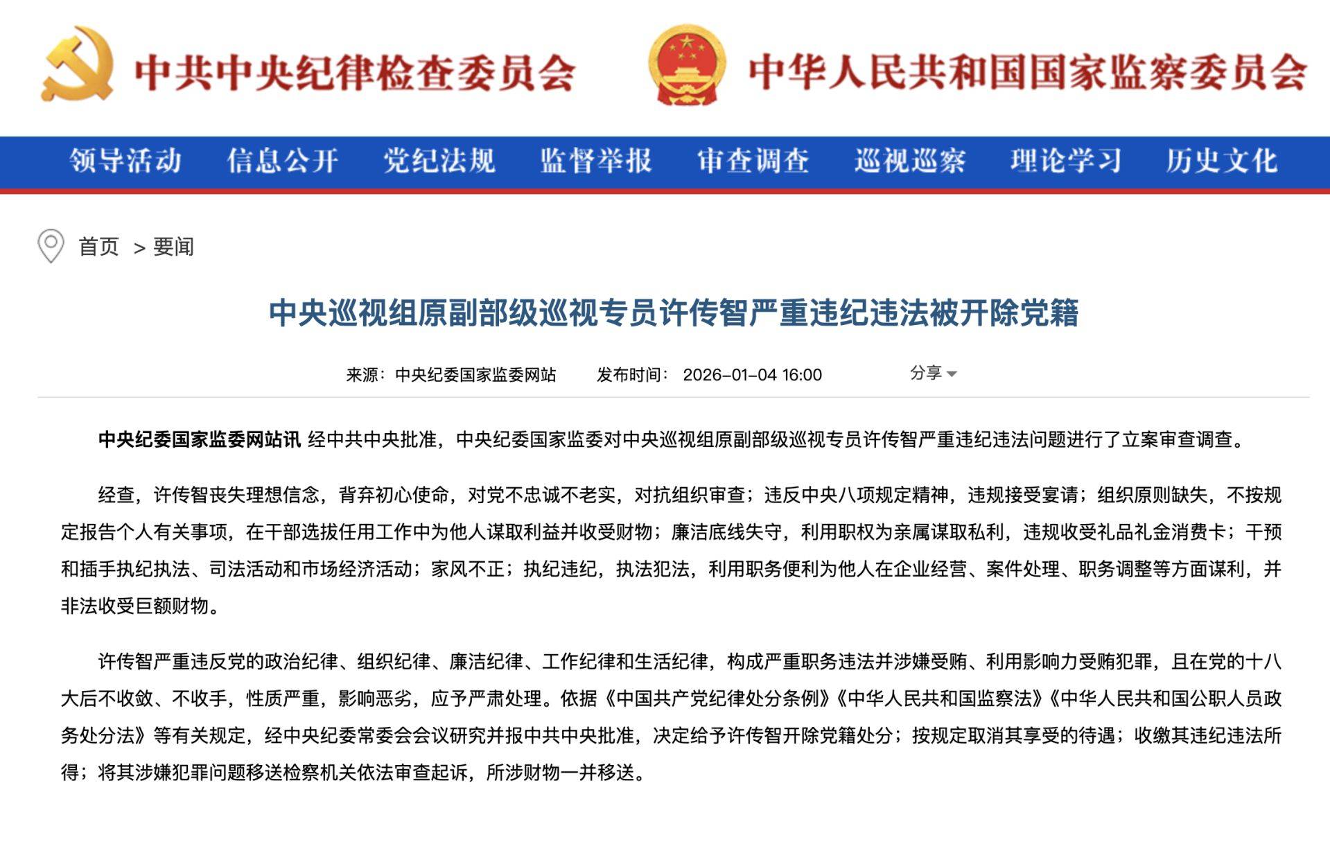 中央巡视组原副部级巡视专员许传智严重违纪违法被开除党籍