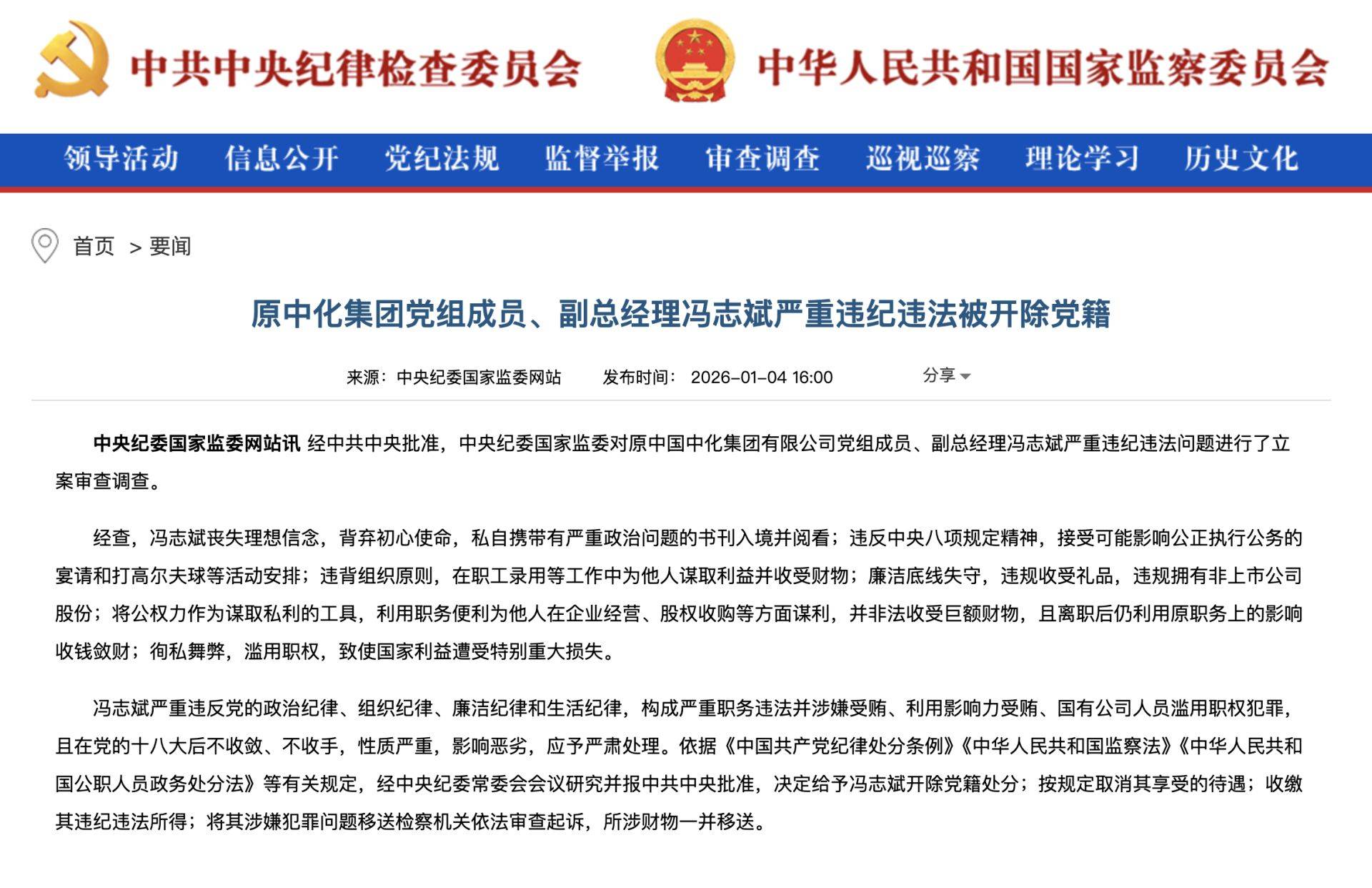 原中化集团党组成员、副总经理冯志斌严重违纪违法被开除党籍
