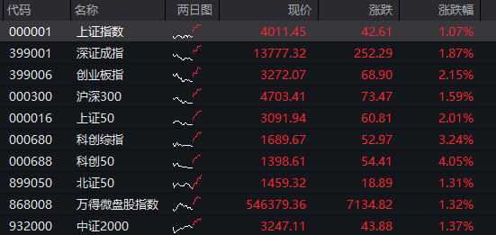 A股:截至午盘收盘,沪指涨1.07%,深成指涨1.87%,创业板指涨2.15%,科创50指数涨4%。