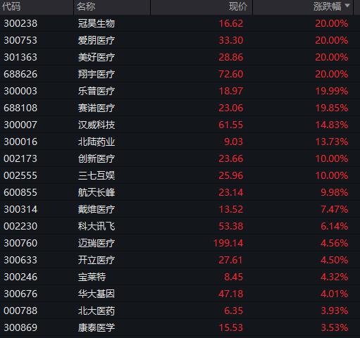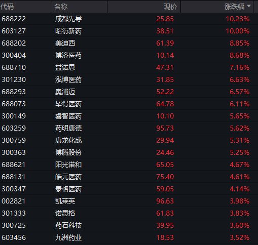 医药板块反弹,CRO概念股大涨,成都先导、昭衍新药涨停,美迪西、博济医药、益诺思等领涨。