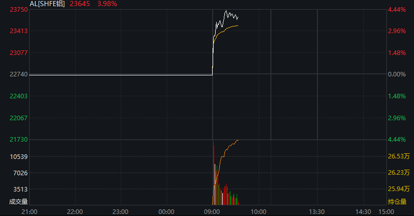 沪铝涨4.44%,至每吨23,750元人民币,创2021年10月以来新高。