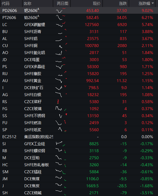 商品:国内商品期货多数上涨,尤其是金属期货,截至午盘收盘,钯金涨9%,铂金涨6%,碳酸锂涨5.7%,沥青、沪铝涨超3%,沪铜涨超2%,氧化铝、鸡蛋、多晶硅、橡胶、沪金、铁矿石、沪银等涨超1%,菜籽、玻璃、不锈钢、燃油、纸浆等上涨;工业硅、螺纹钢、豆粕、热轧卷板、焦煤下跌,焦炭跌超1%,烧碱跌超3%。
