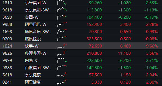 盘面上,大型科网股走势分化,其中快手大涨10%,阿里巴巴涨超2%,小米、百度、京东走低。此外,生物医药股、脑机接口概念股、保险股走势活跃,另外,大摩下调油价预期,因全球供应过剩势将扩大,三桶油走低,中国石油跌超4%,汽车股普遍弱势。