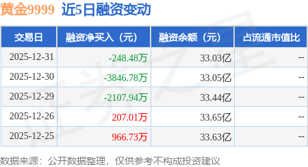 证券之星消息,12月31日,黄金9999(159937)融资买入1.83亿元,融资偿还1.86亿元,融资净卖出248.48万元,融资余额33.03亿元。