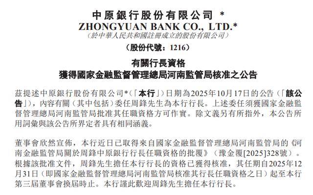 日前,中原银行发布公告称,周锋担任该行行长的资格已获得核准,其任期自2025年12月31日起至该行第三届董事会换届时止。