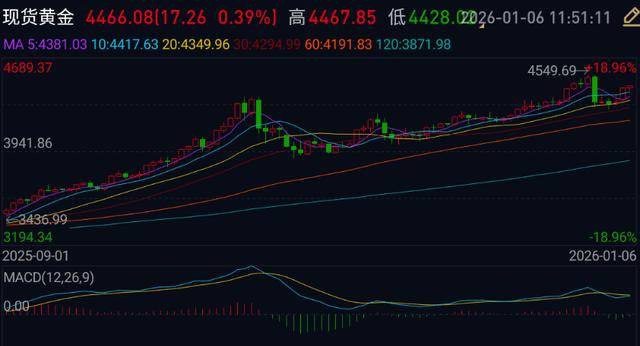 亚市早盘,现货黄金交投于4454美元/盎司附近,金价周一攀升至一周高位,白银、铂金等贵金属也全线走强。