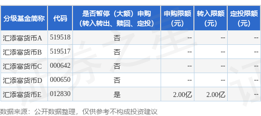 注:1、自2026年01月06日起(含2026年01月06日),汇添富货币E暂停代销渠道大额申购、大额转换转入、大额定期定额投资业务,单日单个基金账户单笔或多笔累计申购、转换转入、定期定额投资的金额不应超过200000000人民币元(含200000000人民币元)。当单日某基金账户单笔或多笔累计申购、转换转入、定期定额投资该份额的金额超过200000000人民币元,本公司将部分或全部拒绝。该份额暂停上述大额业务期间,其他业务仍照常办理。本基金汇添富货币E恢复代销渠道大额申购、大额转换转入、大额定期定额投资业务的具体时间将另行公告。