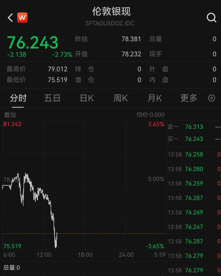 现货白银一度跌破76.00美元/盎司关口,截至发稿,跌幅有所收窄,最新报76.24美元/盎司,日内跌2.73%;COMEX白银期货主力最新报75.41美元/盎司,日内跌2.84%。