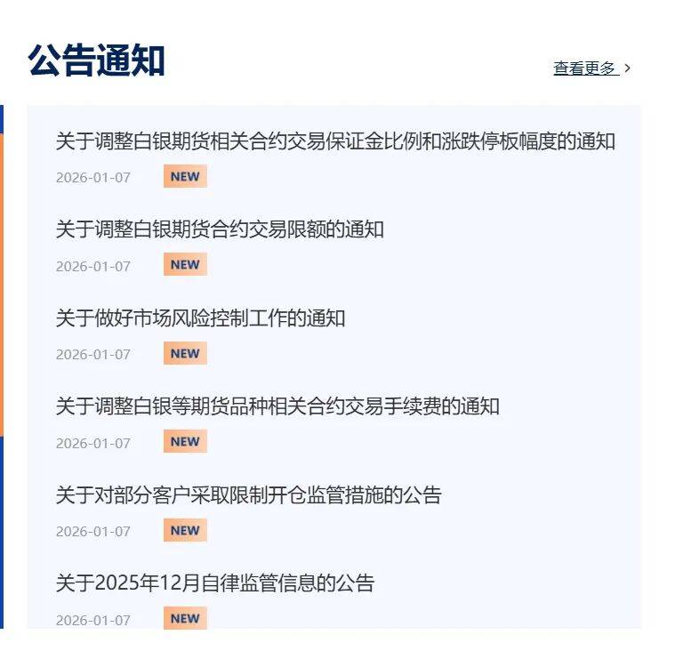 此外,上期所宣布调整白银等期货品种相关合约交易手续费。根据通知,自2026年1月9日交易(即1月8日晚夜盘)起:白银期货AG2604合约日内平今仓交易手续费调整为成交金额的万分之二点五。锡期货SN2602合约日内平今仓交易手续费调整为15元/手。