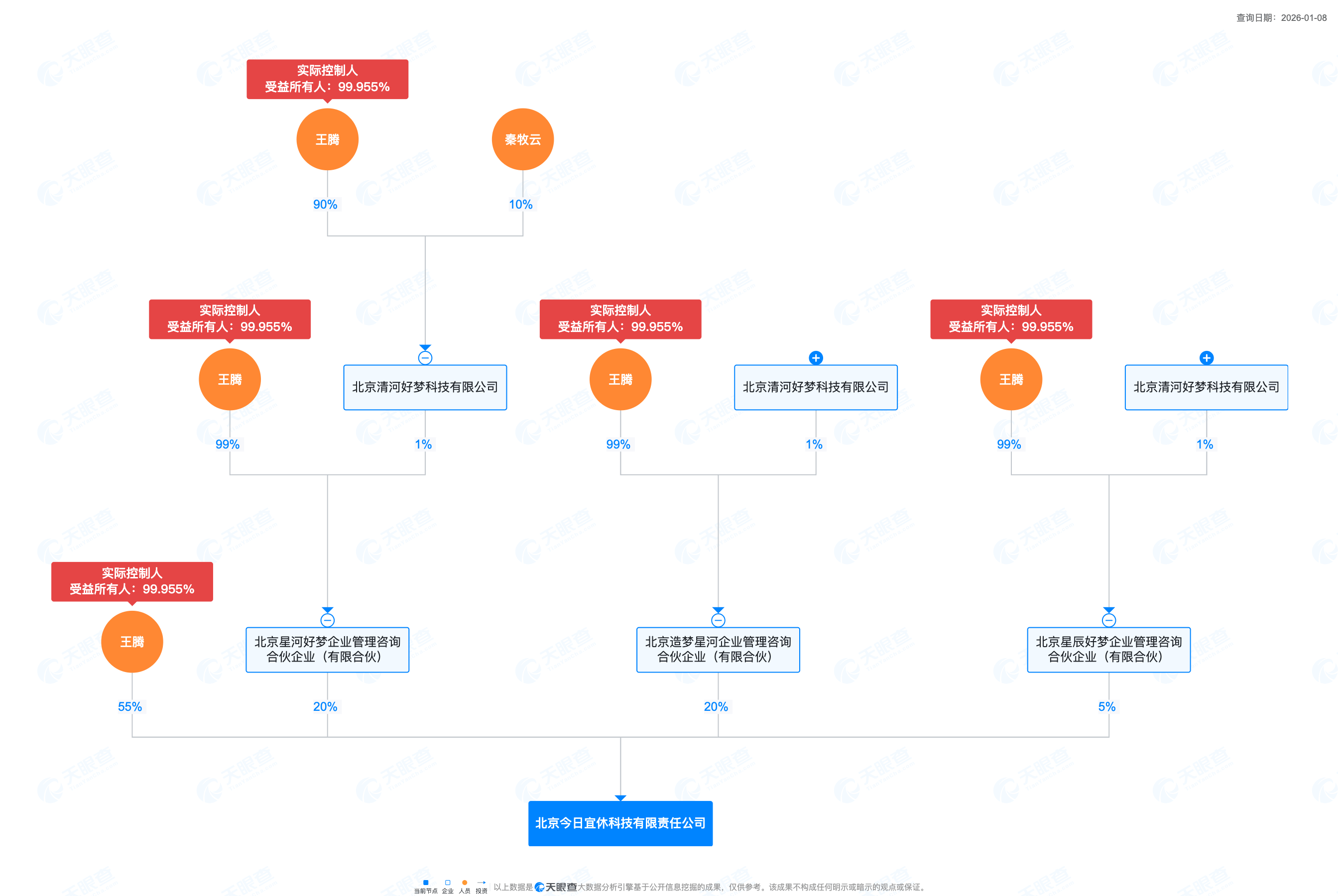 目前王腾是该公司实际控制人,持股比例为55%,其他股东还包括北京星河好梦企业管理咨询合伙企业(有限合伙)、北京造梦星河企业管理咨询合伙企业(有限合伙)、北京星辰好梦企业管理咨询合伙企业(有限合伙)。但星河好梦、造梦星河、星辰好梦这三家公司的实际控制人同样为王腾。