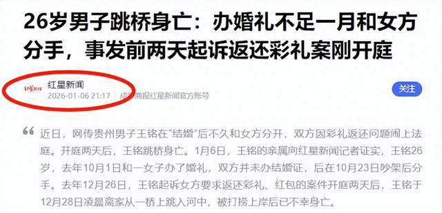 结婚本是人生喜事,可是,对贵州26岁的王铭来说,这场婚姻却成了催命符。为了凑够彩礼,家里贷款10万。结婚才23天,两人就闹到离婚。王铭想要回彩礼,结果被女方反诉索赔19万。庭审结束才两天,这个本该意气风发的年轻人,就从十八九米高的万寿桥上跳了下去,把生命永远留在了冰冷的河水里。