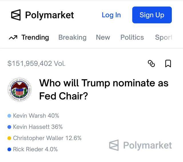 据市场预测平台Polymarket数据,截至1月9日,沃什以41%的当选概率成为下一任美联储主席的最热门人选,超越白宫经济顾问哈西特的36%,此前,市场概率显示凯文·哈西特领跑。此外,沃勒也有13%的概率当选。而里德当选概率仅为4%。