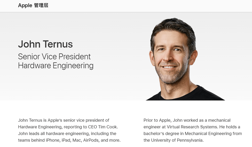 特努斯现年50岁,是苹果公司高管中较年轻的一位。他2001年加入公司产品设计团队,2013年开始担任硬件工程副总裁,任职期间负责多项具有开创性产品的硬件工程研发工作,也是苹果Mac电脑从使用英特尔芯片向使用自研芯片转型的关键推动者之一,他还参与了苹果可折叠手机的研发工作。