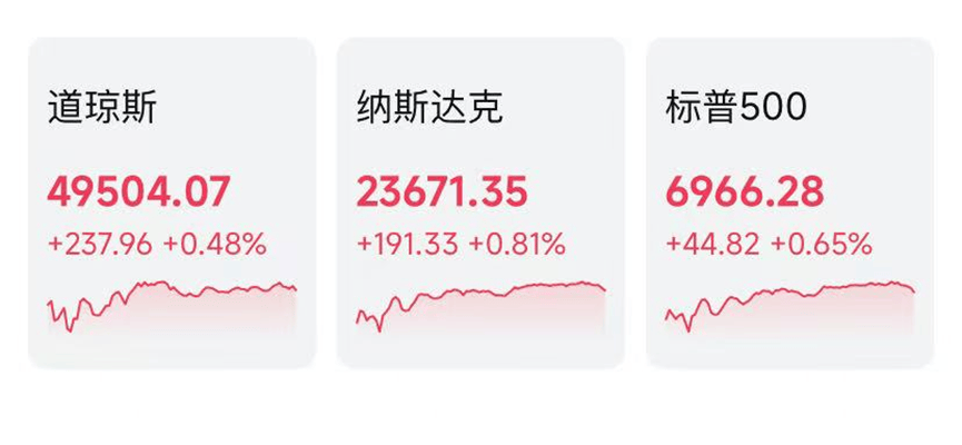 当地时间周五,美股三大股指全线收涨。道指涨0.48%报49504.07点,标普500指数涨0.65%报6966.28点,纳指涨0.81%报23671.35点。其中,道指、标普500指数均创历史收盘新高。从全周来看,道指本周累涨2.32%,标普500指数涨1.57%,纳指涨1.88%。