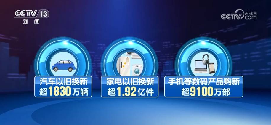 其中,汽车以旧换新超1830万辆,家电以旧换新超1.92亿件,手机等数码产品购新超9100万部。