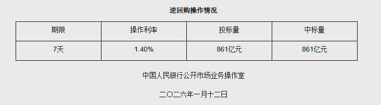 中新网1月12日电 据央行网站消息,2026年1月12日中国人民银行以固定利率、数量招标方式开展了861亿元7天期逆回购操作。具体情况如下: