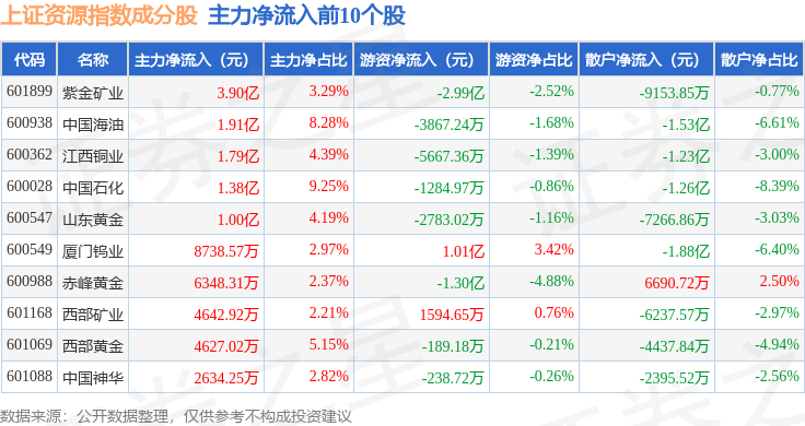 资金流向方面,上证资源(000068)指数成份股当日主力资金净流出合计14.36亿元,游资资金净流入合计2.43亿元,散户资金净流入合计11.93亿元。成份股资金流向详情见下表: