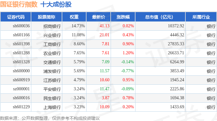 国证银行(399431)指数十大成份股详情如下: