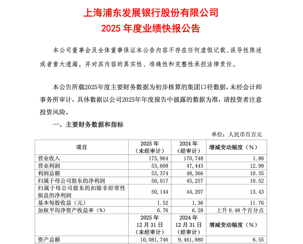 1月13日晚,浦发银行(600000.SH)率先发布2025年业绩快报。